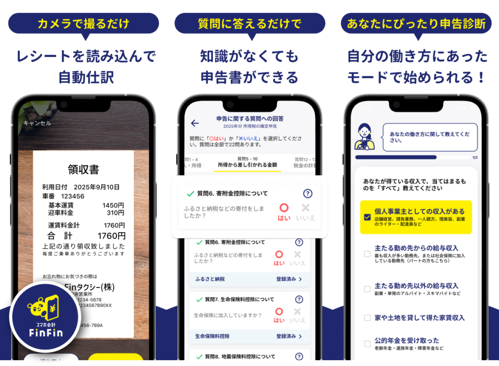 「スマホ会計FinFin」は、スマホだけで一番かんたんに全自動で確定申告を完結できる、を開発コンセプトにした会計アプリです。銀行APIやAI-OCRを駆使し、仕訳の自動化を極力行うとともに、確定申告初心者でも、かんたんに最後まで到達できるよう、会計バンク独自の対話型UXUIを搭載しています。